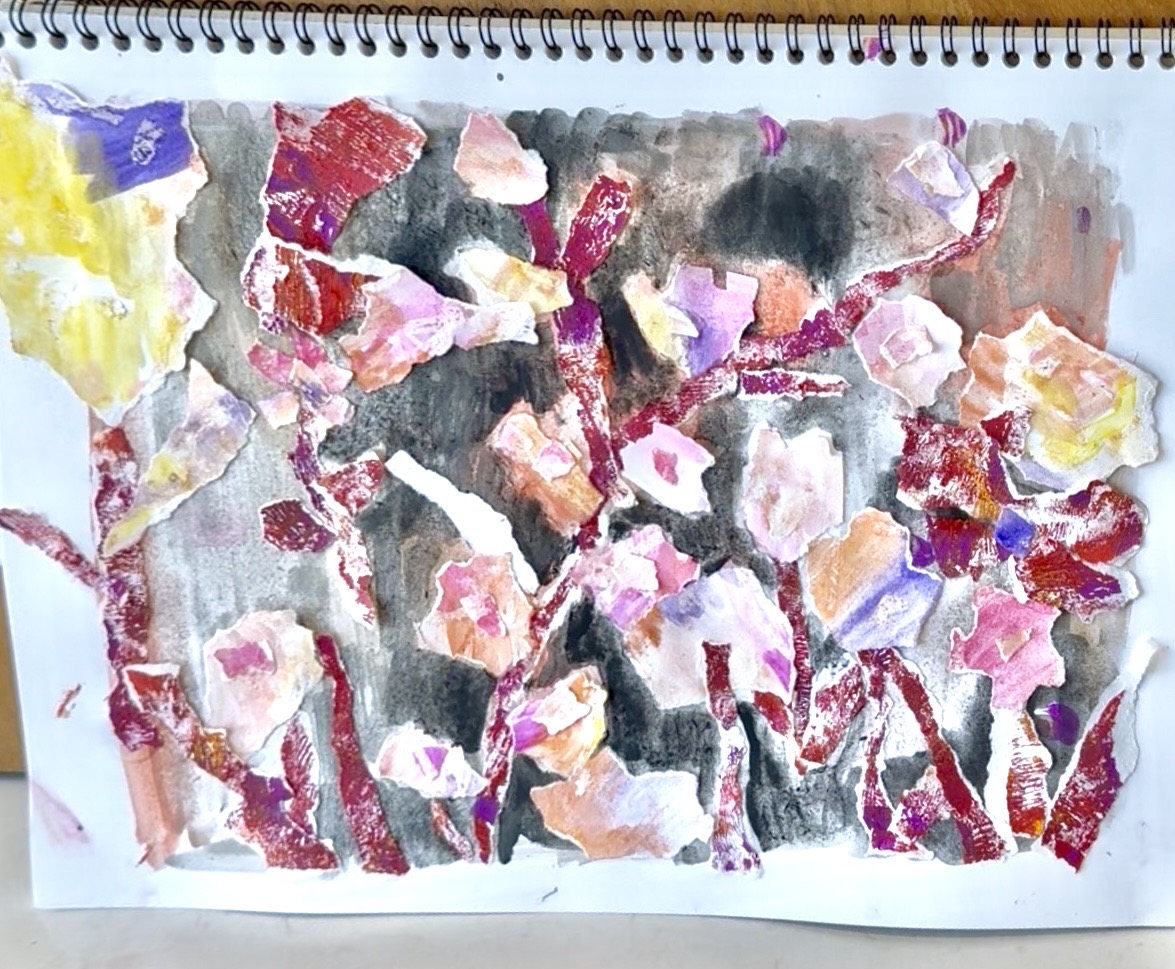 Teacher's comment: She spent quite a long time on this collage, and every element was made using her watercolor paintings. She carefully created each part of the landscape, along with the character—Chikawa, one of her favorites! She’s truly obsessed with it, so I encouraged her to incorporate it into the collage. The result is a beautiful landscape collage with elegant colors and a thoughtful composition.
