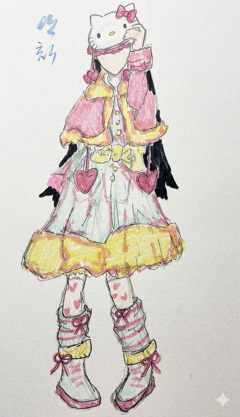 Teacher's comment: Usually she works on paper with pencil or similar materials, and at her age I really want her to start trying combinations — using different materials together based on what she has already drawn.For this project, we first created a watercolor background, then cut out the characters and designs she had made previously and arranged them on top. It turned out very successful, and I really like the result. Nov28,2025